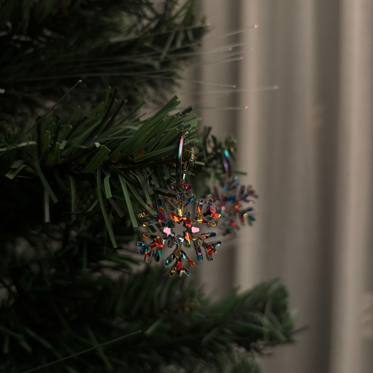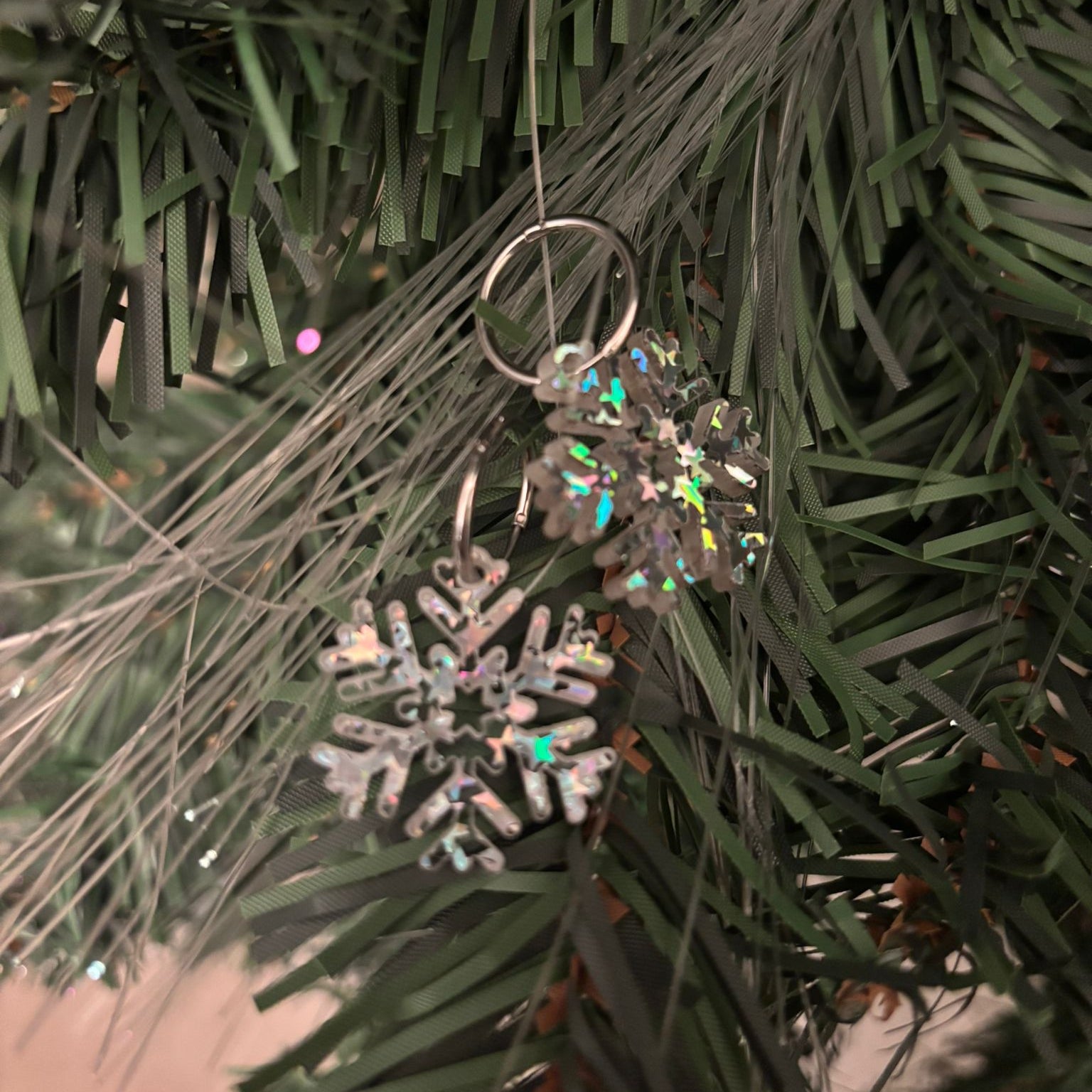 Haz brillar tus looks invernales con estos espectaculares pendientes de copo de nieve en acrílico, decorados con purpurina plateada, lentejuela de estrella y un encantador confeti multicolor estilo bola navideña. Su diseño combina la magia del invierno con el espíritu alegre de la Navidad, creando un accesorio vibrante, llamativo y lleno de luz.