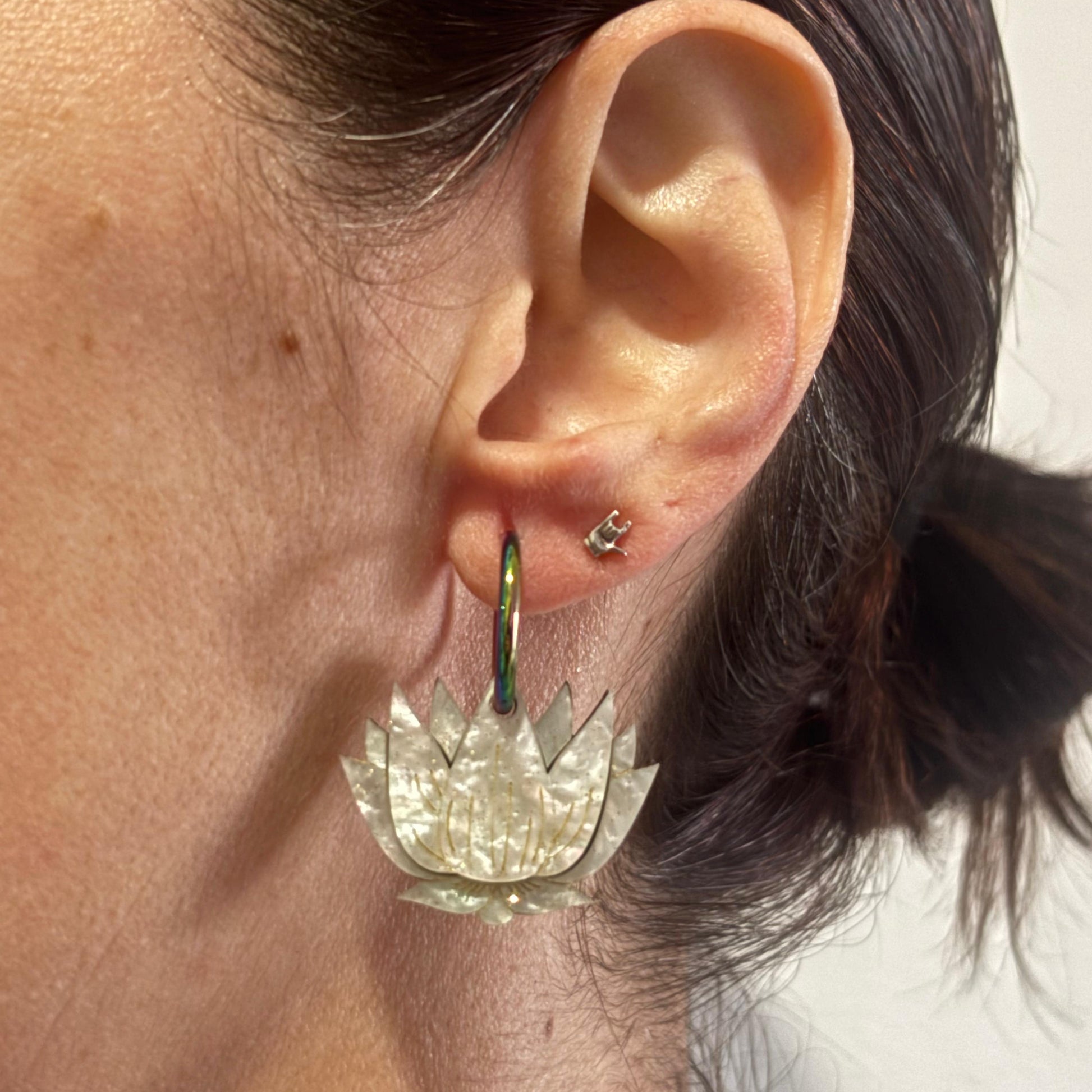 Eleva tu estilo con nuestros pendientes de flor de loto, un símbolo de pureza, renacimiento y equilibrio. Inspirados en la delicadeza de la naturaleza y elaborados en acrílico efecto mármol, estos pendientes combinan ligereza, elegancia y un diseño atemporal que no pasa desapercibido.