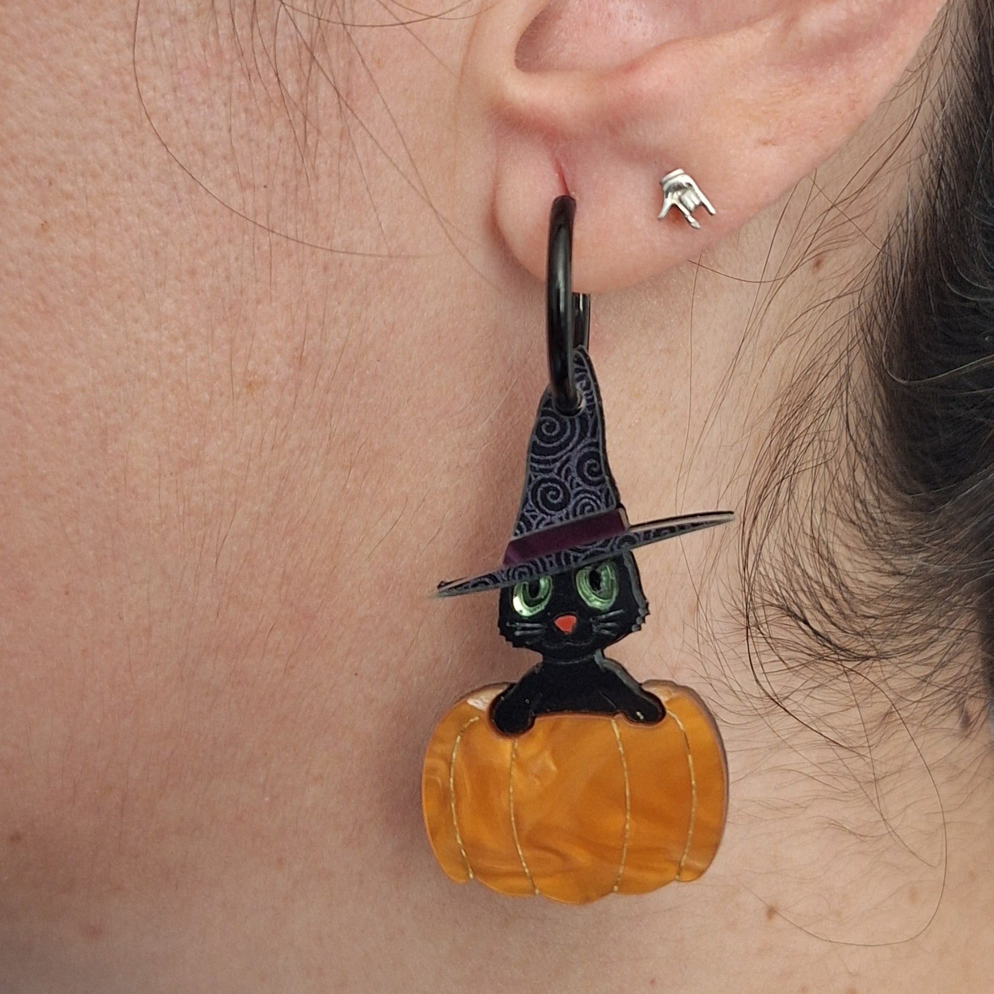 Pendientes de Gato Brujo con Calabaza en Acrílico Efecto Mármol y Brillante